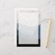 Stationery with a photograph of beautiful mountains, cloudy sky, and rolling hills filled with trees in the foreground. Grey blue colour scheme.