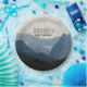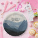 Baby Shower or other event paper plates with a photograph of beautiful mountains, cloudy sky, and rolling hills filled with trees in the foreground. Grey blue colour scheme.