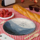 Wedding paper plates with a photograph of beautiful mountains, cloudy sky, and rolling hills filled with trees in the foreground. Grey blue colour scheme.