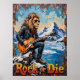 This dynamic artwork features a lion, sporting cool sunglasses and a leather jacket, intensely playing an electric guitar while crouching on a snowy mountain. Below, a serene blue lake is visible, flanked by pine trees and distant peaks. The painting's thick, textured brushstrokes give a raw, energetic feel to the snow and water, powerfully conveying the "Rock or Die" spirit of this unique performer.