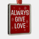Always Give Love red Christmas ornament with white snowflakes and inspirational words.
