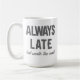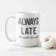 Simple Black and White Coffee Mug reading "Always late but worth the wait". Perfect gift for the person in your life who is always late. Design is transferable to a variety of different mug styles and sizes.