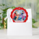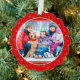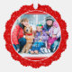 This paper ornament card features a border pattern of pale white icons on red including holly, snowflakes, stars, candy canes and Christmas stockings and presents. Replace the photo on the front with your own favourite pic, and keep or customise the text on the back including the customisable greeting (currently "MERRY CHRISTMAS") , the custom message (currently a customisable "Wishing you all the best of the season!"), sign-off signature and the current year.