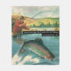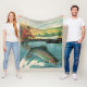 Vintage image of a man fly fishing on a lake and hooking a big fish. Fun blanket to personalise with the name of your favourite lake to fish on. Always wishing for a good day of fishing. Colourful fishing themed gift for someone who loves to fish.