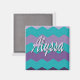 This chevron patterned magnet is personalised with the name Alyssa. The chevron is comprised of textured bright blue stripes alternating with textured purple stripes that gradate from dark purple to light lilac. It's perfect for your favourite Alyssa to put on her fridge or in her school locker.