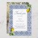 Amalfi Coast Italy Mediterranean Lemon wedding Thank You note, with blue tiles, lemon and blue frame. Just change with your photo on the back.