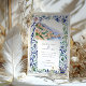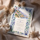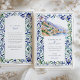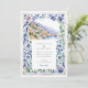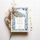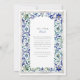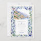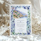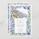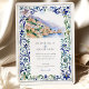 The scene is beautifully framed by an intricate border inspired by traditional Italian Majolica tiles. Delicate, hand-painted watercolor swirls in shades of classic blue, sage green, and muted yellow create an elegant and artistic frame. Combining the scenic vista and the ornate tile pattern evokes a sense of timeless European romance. Your wedding details are presented in a sophisticated pairing of classic serif and graceful script fonts, completing this truly special design.