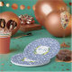 This paper plate design features a watercolor lemon wedding crest design against a blue and white tile background.