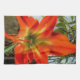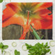 This Kitchen Towel showcases the intense beauty of a flower, an Amaryllis blooming in the garden. The original photograph by ZoeSPEAK is a closeup, and the details of the flower, the shapes and color changes from the center outward are amazing. From soft shades of green blending into yellow, the bloom finishes with five outstretched petals in deep, rich oranges against a background of green leaves and muted brown wood.