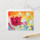 Amaryllis Morning Glories Postcard. This colourful card depicts a spray of Red Amaryllis and Morning Glories on an orange and blue background.