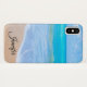 A personalised phone case with a photograph of a clear blue ocean scene with gentle waves along a seashore and soft brown sand. A blue sky with fluffy clouds off in the distance. Serene tropical idyllic seascape.