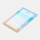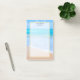 Large sized sticky notes with your personalised wedding info. Designed with a photograph of a clear blue ocean scene with gentle waves along a seashore and soft brown sand. A blue sky with fluffy clouds off in the distance. Serene tropical idyllic seascape. A gold bordered semi-transparent overlay layered on top.