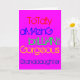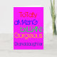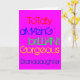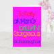 To a totally amazing, brilliant, gorgeous granddaughter. A Happy Birthday greetings card with words of praise in red, blue, green and yellow text on deep pink.