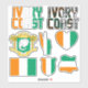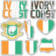 Amazing Ivory Coast Shapes National Symbols Sticker. Two country name stickers, one in the colours of the national flag and the other one covered in the Word Cloud with the words "Ivory Coast" written in the different alphabet forms and/or languages and fonts. All words are coloured with the national colours used on the flag of Ivory Coast, Beautiful heart, shield (escutcheon) and map filled with the representation of the Ivory Coast national flag. Hand sticker with the two fingers up, representing victory filled with the colours of the Ivory Coast national flag. The last two stickers are national flag of the Ivory Coast and the national Coat of Arms. This is the great set of superb stickers with most of them unique and hand drawn. All stickers are fully customisable using "Customise it!" feature. You can mix and match them as you wish. If you want multiple hearts but no shield fire away. Maybe you want only hand with the victory sign? Easy, remove everything else and make multiple copies of the hand. These grand stickers are the perfect sticky gift for any occasion. Fire away and stick them where your heart desire! © 2022 CountriesOfTheWorld