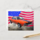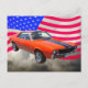 Classic orange 1969 AMC Javlin muscle car photo with American Flag background.