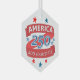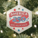 Create your own America 250 glass ornaments as fun patriotic holiday gifts for family and friends and perhaps yourself as well. Personalize with your state or other text on the red ribbon style design which is surrounded by a smattering of red and blue stars. America 250 merchandise is a patriotic way to celebrate 1776 2026 America's 250th anniversary and these collectible red, white and blue glass hexagon Christmas tree ornaments are a chic way to commemorate this historic event. Proudly display these semiquincentennial ornaments in the holiday tree or hanging from a bookcase or shelf or hanging platform as a treasured keepsake.