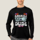 A chic 'America Dude' T-shirt for the US Independence Day celebration. The design features American Flags, patriotic goggles, stars and stripes in red, blue and white. Back has a matching design.