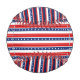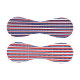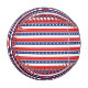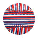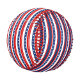 A baseball with red stitching and a design of red and blue stripes with white stars on a white background.