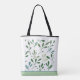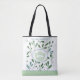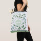This tote bag is shown with a fresh leaf print in soft green tones. In centre on front is an American iconic crown pageant crown in soft melon green sample text at the top for you to personalise. Multi-coloured print of greens over white. Text and crown image on front only. Back has same leaf print.