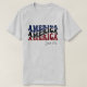 Perfect for the 4th of July, but appropriate all year long! This shirt repeats the stylised text "AMERICA" in blue, black, and red. At the bottom is the black script "Since 1776".