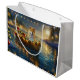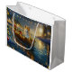 Set sail into the magic of the holiday season with this beautifully detailed illustration, showcasing a proud dog sitting in a festively decorated boat, gliding across a serene Christmas lake. The twinkling lights from nearby pine trees reflect off the water, casting a warm, festive glow that enhances the cosy ambiance. Ornaments dangle from the boat's sides, while glowing lanterns light the way, creating a scene that captures the true essence of Christmas warmth and joy. This nostalgic artwork brings a touch of holiday magic to any space, perfect for those who cherish the spirit of the season.
