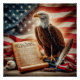 Show your love for America with our stunning image featuring an American bald eagle perched on the U.S. Constitution. The eagle, a symbol of freedom and strength, stands proudly against the backdrop of the American flag. This high-quality image is a must-have for any patriotic home or office.