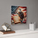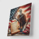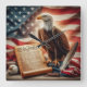 Show your love for America with our stunning image featuring an American bald eagle perched on the U.S. Constitution. The eagle, a symbol of freedom and strength, stands proudly against the backdrop of the American flag. This high-quality image is a must-have for any patriotic home or office.