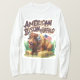 American Buffalo Bison in the black and gold text. An American bison buffalo standing in front of an American flag in the background.