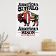 A stylised illustration of an American bison with bold colours and geometric patterns.