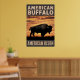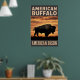 A silhouette of an American bison standing in a field against a vibrant sunset sky.