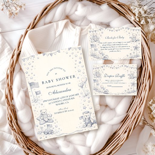 Celebrate a little all-American arrival with this charming patriotic baby shower design. Featuring soft red, white, and blue tones, gentle bunting, stars, and sweet illustrated details, this design feels classic, warm, and timeless rather than loud or novelty. Perfect for summer celebrations, military families, or anyone who loves a subtle Americana aesthetic, it offers plenty of space for your event details while keeping a cozy, storybook feel.