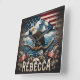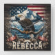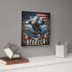 A majestic eagle perches on a branch with mountains and an American flag in the background, symbolising freedom and strength in nature.