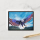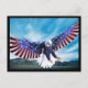 American Eagle Postcard has a eagle flying with a American flag on him in his feathers on this postcard with red white and blue on the flag.