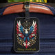 An illustration of a bald eagle with its wings spread wide, featuring the colours of the American flag.