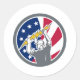 Icon retro style illustration of American electrician, lineman holding lightning bolt with United States of America USA star spangled banner stars and stripes flag inside circle isolated background.