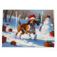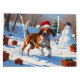 A heartwarming holiday illustration featuring a cheerful dog playing in the snow, wearing a Santa hat and surrounded by colourful gift boxes. In the background, children build a snowman beside a snow-covered Christmas tree, creating a joyful winter wonderland. Perfect for spreading holiday cheer and capturing the magic of Christmas.