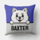 A personalised American Eskimo Dog throw pillow for dog lovers, with a cute American Eskimo Dog puppy peeking over a ledge and a custom text box where you can type in your dog's name or any other text. A fun customisable gift for American Eskimo Dog lovers.