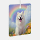 A personalised American Eskimo Dog memorial ornament with a painting of a happy American Eskimo Dog on an idyllic heavenly hill with a beautiful rainbow overhead. Symbolising the American Eskimo Dog has passed the rainbow bridge to doggy heaven. Personalise it with your own American Eskimo Dog dog's name (or any other text) on the back side of the ornament. Makes a wonderful memorial gift for any American Eskimo Dog dog lover.