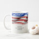 American Flag Custom Mug. Settle into your golden years with this patriotic retirement coffee mug. Created with a textured background and flying an American flag with a vintage watercolor style. Coordinating party supplies are available in the MetroEvents shop on Zazzle. Additional retirement party invitations are available at Metro-events.com.