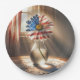 Sunlight streams through a window, illuminating a daisy with petals patterned after the American flag, positioned in a clear vase atop a table with a lace doily