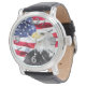 A watercolor rendering of American's symbolic bald eagle in front of the American flag.