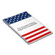 This custom notebook features a patriotic American theme. The top and bottom borders feature the American flag pattern. A banner of white stars over a navy blue background is placed along the top. A banner of red and white stripes is placed along the bottom. A sample family name followed by a line of additional text is printed across the centre of the notebook, which you can personalise to include your own custom name or other text.