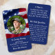 Premium USA American Flag Memorial Funeral Prayer Card. This military memorial prayer card features a United Staes of America Flag in a modern design . Front "In Loving Memory" Personalise this military funeral prayer card with your loved ones photo, name & dates, and sentiment. Front "In Loving Memory" " Heroes Live Forever". Personalise this military funeral prayer card with your loved ones photo, name & dates, and sentiment. Back quote "A Hero is...someone who has given his or her life to something greater than oneself." and Prayer "We Hold You Close." , please reach out if you would like a design with a specific poem other than. This American Flag prayer card is a treasured keepsake, honour a fallen soldier, military funeral services, and veteran memorial service or celebration of life. In Loving Memory Military Memorial American Flag Prayer Cards. COPYRIGHT © 2020 Judy Burrows, Black Dog Art - All Rights Reserved. American Flag Memorial Fallen Soldier Prayer Card