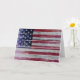 Patriotic blank note card features partial image of the American flag with a painted effect over distressed wood planks with rustic, country charm.