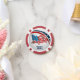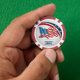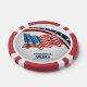 A poker chip with a red and white border, the centre of the chip has a waving American flag, with a blue field of stars and red and white stripes, above the flag is a red and blue curved stripe with white stars, below the flag is the text "United States of America" in blue. The background is a solid white. The style is digital illustration.