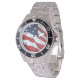 Has heft and feel of expensive stainless steel quartz watches. Good band with safety catch. I removed links, which is easy because engraved arrows show direction to push the linking pins. As always by this seller, the image (a railroad logo) is a perfect reproduction of my emailed image, and is precisely spaced and aligned.