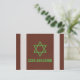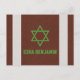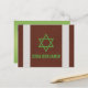 Brown, green, black, and white American football Bar Mitzvah personalised thank you postcard. This American football Bar Mitzvah thank you postcard design features a brown leather dimpled background that looks like the leather of a football on the front. There are also two vertical white stripes similar to what are found on a football ball as well. This brown and white football ball background is paired with a sports style accent font and a Jewish Star of David in green. This football Bar Mitzvah flat thank you postcard would work well for a NFL football or Super Bowl themed Bar Mitzvah. This football sports Bar Mitzvah thank you card could work for any season and is a great choice for a boy who loves American football.