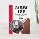 Red American Football Coach Football Ball Photo Thank You Card. Thank you football coach card with a photo in oval frame, coach name, team name, year, player`s name. Red stripe. Great thank you card for the football team coach!