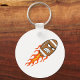 This design is of an american football that is on fire. It is done in a cartoon style. The american football is flying through the air with flames coming out the end. The football also has a face which has an angry determined expression. This american football on fire design looks great on this keychain. Perfect for yourself or as a gift