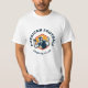 This dynamic t-shirt features a bold logo design for an American football sports club. The logo includes a shield shape with the words “AMERICAN FOOTBALL” at the top, an illustration of a player in motion holding a football, and the words “SPORTS CLUB” at the bottom. The design is accented with three stars and uses a striking colour palette of dark blue, white, and orange. Perfect for fans of American football and sports enthusiasts.